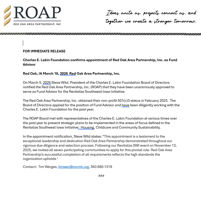 The Red Oak Area Partnership (ROAP) has received official confirmation that it will serve as the Fund Advisor for the Charles E. Lakin Foundation’s Revitalize Southwest Iowa Initiative, marking a significant milestone for the community.